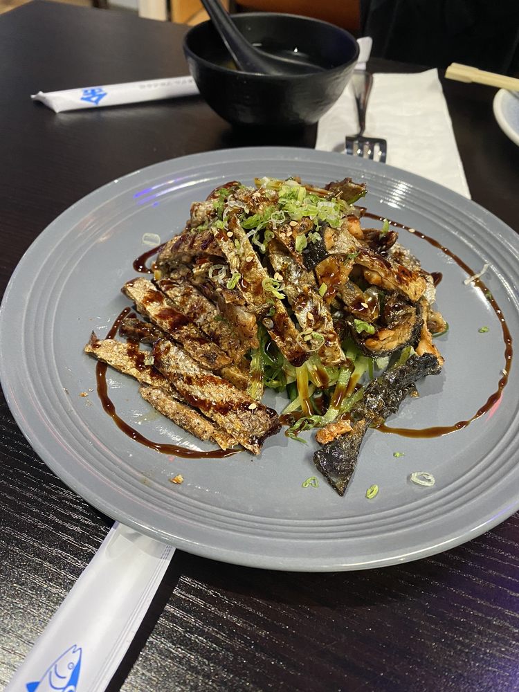 Crispy salmon skins adorned with cucumber, seaweed salad, and spring mix greens and topped with eel sauce.